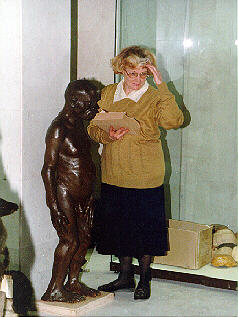Заведующий сектором ИЗО Удальцова В.А., автор раздела "Антропогенез" зала "Макроэволюция", с муляжом африканского пигмея. 1997 г.