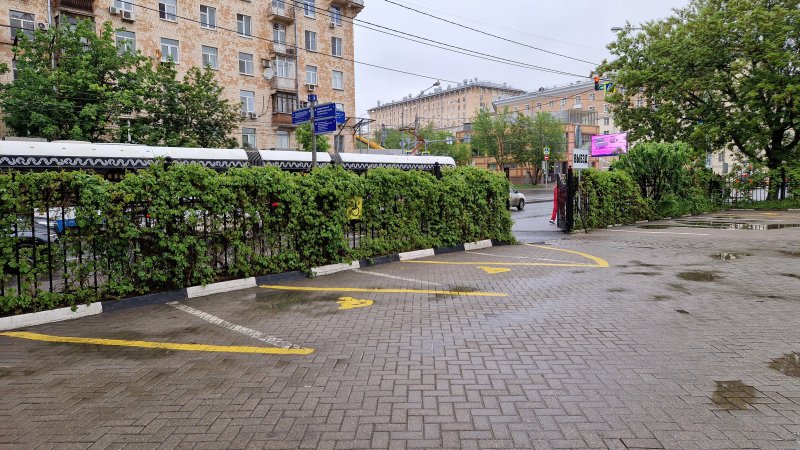 Парковочные места слева и справа от ворот со шлагбаумом, а также напротив выставочных залов музея